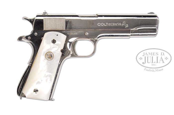 Correction: Factory records indicate this gun was ordered with Blue finish. Shipped to Kruse & Bahlman, Cincinnati, Ohio, Jan. 2, 1929. 1 or 2 in shipment. *SCARCE NICKEL PRE-WAR COLT GOVERNMENT MODEL SEMI-AUTO PISTOL. SN C155359. Cal. 45 ACP. Nickel finish with 5″ bbl, orig thick fixed sights with wide full checkered spur hammer and long tang safety with checkered, arched spring housing. Fitted with silver medallion smooth pearl grips and accompanied by one orig nickel plated magazine. Pre-war nickel finish Government model pistols are scarce until about 1935 when nickel finish became available as a standard option. This pistol was produced in 1929. PROVENANCE: John Irwin Estate Collection. CONDITION: Very fine. Overall retains virtually all of its orig factory nickel with light muzzle end wear on the slide and fine scratches on the slide. Grips are sound with a couple of minor age lines and retain great fire & color. Mechanics are crisp, strong bore with good rifling, pitted in the grooves. 4-36812 JR41 (2,500-4,000)
