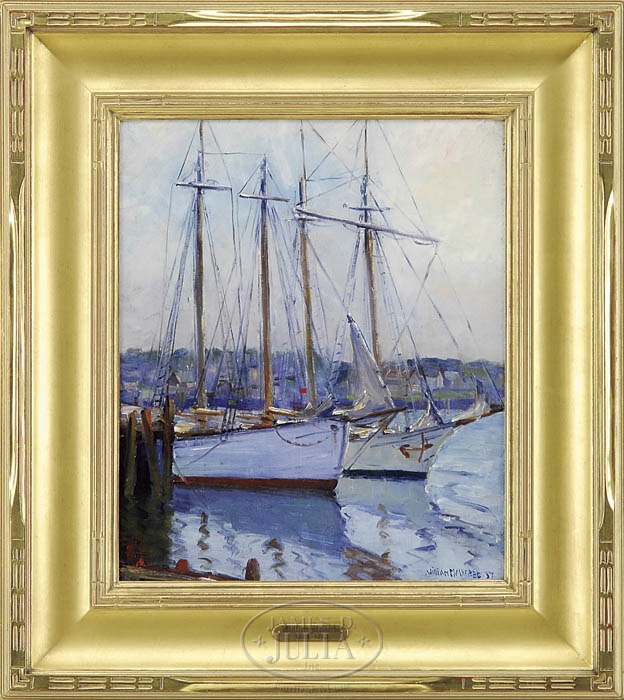 WILLIAM MALHERBE (American, 1884-1951) HARBOR TWINS. Oil on canvasboard harbor scene shows side by side two-mast schooners moored next to wharf with houses dotting the far shore. Signed lower right and dated “37”. Housed in a fine carved wood and gilt frame with wide carved and gilt liner having a gilt wood artist plaque. SIZE: 19″ x 16″. CONDITION: Very good with very minor touch-up. 9-99108 (2,500-4,500)