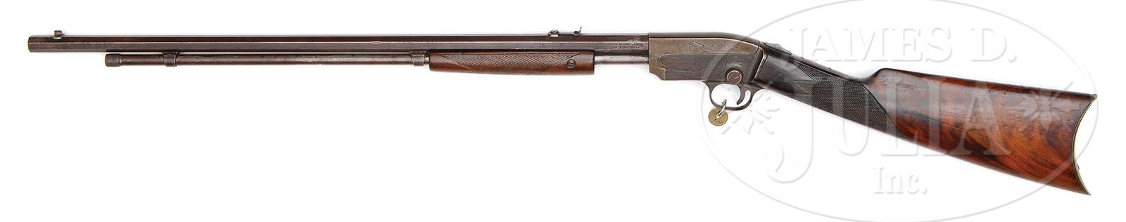 *FACTORY ENGRAVED MODEL 15 MERIDEN RIFLE. SN 12188. Cal. 22. 24″ full oct bbl, nicely engraved receiver with game scenes on both sides. Fancy deluxe checkered walnut stocks with rifle style buttplate. PROVENANCE: Wes Adams Estate Collection. CONDITION: Very good overall. Bbl turned mostly a plum brown patina with what appears to be some vise marks on sides of bbl near breech. Receiver has traces of blue, mostly plum brown patina color. Orig fancy gloss wood has scratches on it but mostly sound with no splits or cracks. Bore about good. 4-44852 LM67 (500-800)