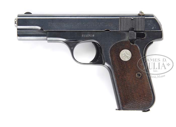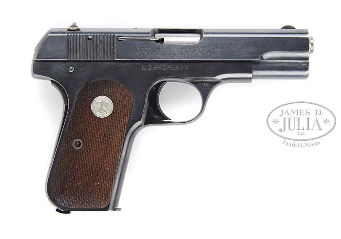 *RARE COLT MODEL 1903 U.S. PROPERTY SEMI-AUTO PISTOL. SN 561708. Cal. 32 ACP. Rare blue finish, one of only about 3,000 pistols with blue finish U.S. Property marked near the end of production. This pistol has a 3-3/4″ bbl, fixed sights and full checkered walnut grips with silver Colt medallions and is accompanied by an orig 2-tone magazine with marked base. Right side of frame is marked “U.S. PROPERTY”. The U.S. Government purchased approx. 200,000 Model 1903 pistols in both 32 ACP and 380 ACP in the period 1941-1945 with them acquiring the 3,000 blue finish pistols from regular assembly at the tail end of production. Reference The Book of Colt Firearms, Sutherland & Wilson. PROVENANCE: John Irwin Estate Collection. CONDITION: Very fine to extremely fine. Overall retains about 98% strong orig factory blue with only light sharp edge wear and some minor dulling of right rear edge of grip frame. Front strap is strong & clean with back strap showing some slight thinning. Grips have a few scattered chipped diamonds and show light to moderate wear on right side. Mechanics are crisp, bright shiny bore. 4-36813 JR49 (2,000-4,000)