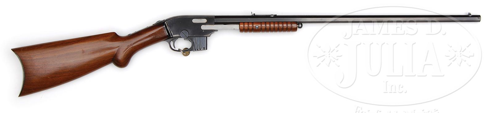 Please Note: There is a typographical error in the title. This is not a Model 14, it is a Model 1903. *SAVAGE MODEL 1903 PUMP ACTION RIFLE. SN 136213. Cal. 22. 24″ full oct bbl with orig sights, rounded pistol grip wood with rifle style buttplate, Gun manufactured for about 10 yrs and only about 3,000 units, making it a very rare gun. PROVENANCE: Wes Adams Estate Collection. CONDITION: Excellent plus, featuring nearly all orig varnish as well as 98% plus bright shiny orig blue. Seldom found in any condition and this one is extremely sharp. Bright shiny bore.Excellent inside and out and all orig. 4-44850 LM69 (1,000-1,500)