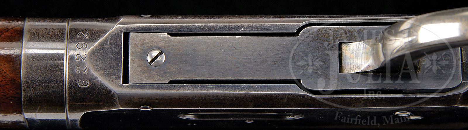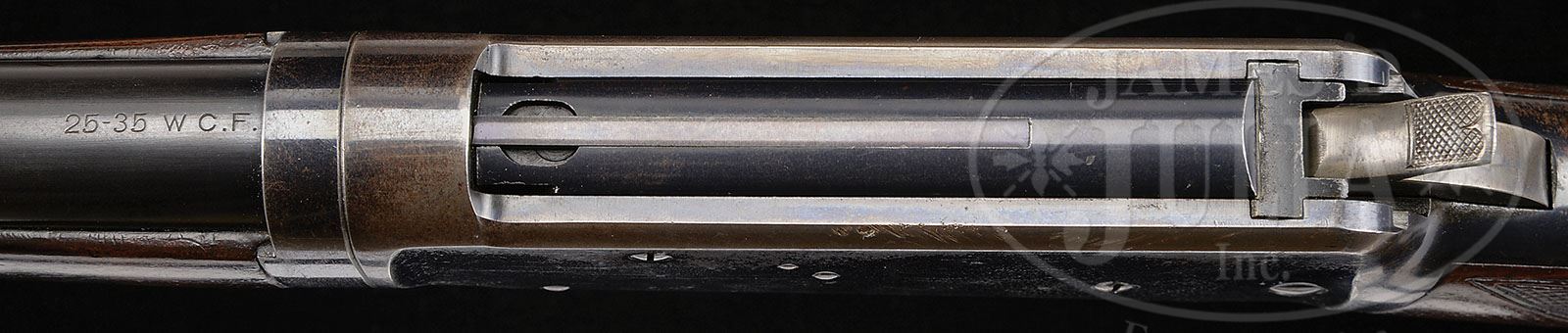 SCARCE ANTIQUE DELUXE WINCHESTER MODEL 1894 LIGHT WEIGHT TAKEDOWN LEVER ACTION RIFLE. SN 62292. Cal. 25-35. Beautiful and scarce deluxe ’94 with 26″ extra light, tapered rnd bbl with pedestal mounted sporting front sight, Marble’s folding leaf rear sight & a locking Lyman tang sight. It has half magazine and is a takedown. Mounted with extremely beautiful burl & flame grain American walnut with H-style checkered forearm and capped pistol grip stock with crescent buttplate. Left side of the lower tang is marked with assembly # “7484” which number is also found on the rear face of the buttstock and inside toe of buttplate. This is a fine second yr production deluxe 94 in a scarce configuration in an equally scarce caliber. CONDITION: Very fine, all matching. Bbl, magazine tube & forend cap retain most of their bright orig factory blue with some thinning on the forend cap and a couple of small spots of wear and a scratch around the front sight. Takedown ring retains most of it’s orig blue, slightly thinned on the bottom. Receiver retains 65-70% orig blue with the loss areas flaked, not worn, to a light patina. Bottom edges of the rifle and floorplate show thinning. Lever & hammer retain strong, bright case colors on the sides faded to silver on the outter faces. Buttplate retains smoky case colors. Wood is sound with a few minor nicks & scratches and retains most of a fine professionally restored finish. Mechanics are crisp. Bright, shiny bore. 4-49014 JR158 (10,000-15,000)