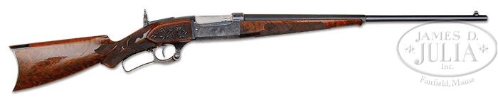 *SPECTACULAR ONE OF A KIND FACTORY ENGRAVED SAVAGE MODEL 1899 RIFLE. SN 70152. Cal. 303. Very rare correct 23″ half oct bbl fitted with no rear sight slot and factory Lyman receiver sight. Gun features engraving similar to Premier or F grade style with a running bull elk surrounded by scrolls on one side and a big horn sheep in a mountain scene on other side. Bottom of receiver is Excelsior matted with grapevine style engraving, similar to Monarch style, with bull moose vignette in center. Deluxe feathercrotch walnut stocks in high gloss lacquer finish features C grade checkering as well as Monarch style carved side panels in front of stock. Correct rifle style buttplate. Vivid case colors on lever. This firearm appears to be the creation of several different styles of engraving, checkering and carving, which is also the conclusion of Savage historian J.T. Callahan, as so started in lengthy factory letter of authenticity. Factory employees put together some of the most elaborate creations, referred to by the company as “Government Jobs”. Truly unique and one of a kind style engraving, undoubted the work of factory engraver, Enoch Tue. Accompanied by letter from family of orig owner, W.I. King. Letter states King was an engraver and wood carver for Savage. One of the finest Savages cataloger has seen. PROVENANCE: Wes Adams Estate Collection. CONDITION: Overall condition is fine with 95% bright orig bbl blue, as well as 95% receiver blue, thinning very slightly. Stock shows very minor use with most all glossy lacquer finish remaining. 4-44814 LM52 (27,500-37,500)