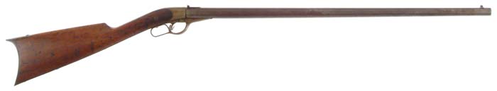 HOWARD THUNDERBOLT RIFLE. SN 745C. Cal. 44 Rimfire. Bbl length: 24-1/2”. Marked “MANUF’D. FOR-HOWARD-BROS.-BY-WHITNEY-ARMS-CO.-WHITNEYVILLE-CONN.” on the right side of the bbl. “C. HOWARD PATENTED.SEPT. 26 &OCT 10.1865-OCT. 28 1862” on the left. Rear sight has a folding leaf but no slide. Dovetailed front sight is a solid block. CONDITION: Gray/brown patina with light rust, pitting, and signs of cleaning. Stock is dented and scratched but retains about 1/2 of the varnish. Mechanically good. 8-76195 (500-1,000)