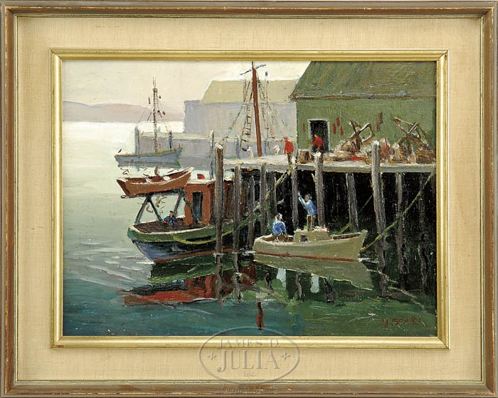 MELVILLE F. STARK (American, 1903-1987) “GLOUCESTER”. Oil on canvas board harbor scene shows a small lobster boat with two lobstermen moored to a large pier with buildings and two workers in red coats. A larger fishing boat is moored at the end of the dock with other boats and buildings beyond. Signed lower right “M Stark”. Housed in a gilt wood frame with linen and gilt inner frame. SIZE: 12″ x 16″. CONDITION: Very good. 9-99421 (1,000-1,500)