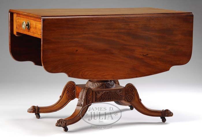 NEW YORK CLASSICAL CARVED FIGURED MAHOGANY PEMBROKE TABLE. IN THE SCHOOL OF DUNCAN PHYFE. The rectangular top with hinged shaped leaves above the frieze with drawer and dropped pendants joined to an elaborate acanthus carved standard on a platform base raised on four out-swept legs with scrolled acanthus carved knees terminating in carved feet with square collars on brass casters. PROVENANCE: From a Harpswell, Maine home. SIZE: 28-3/4” h x 22-1/2” w closed x 42” d, top open measures 42” x 52”. CONDITION: Old surface, several toes re-carved, replaced casters. 9-90083 QP (2,000-2,500)