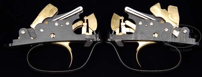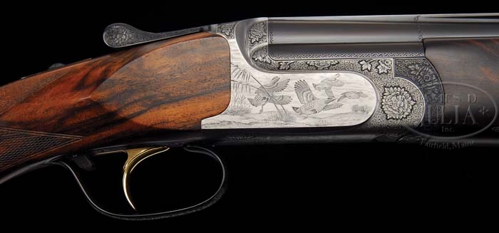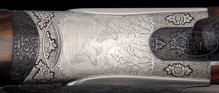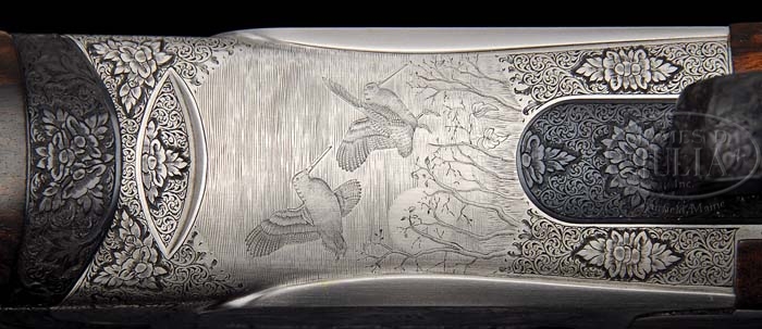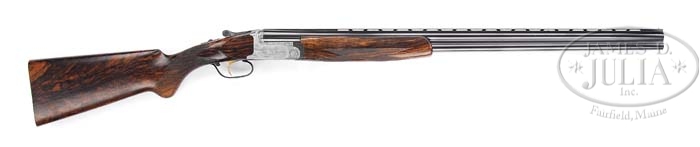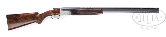 *PAIR OF BADILLINI ENGRAVED PERAZZI MX20 SCO 20 GA. GAME GUNS WITH CASES. SN 115929 & 115930. Cal. 20 Ga. 2-3/4″ Chambers. 29-1/2″ Mono-block bbls have narrow checkered ventilated game ribs with “1” and “2” inlaid in gold, respectively. Left bolsters are marked “Perazzi” and “Brescia Made in Italy”. Bottoms of mono-blocks are marked with SN, proofs, “SCO” and “BSA NY”. Bottoms of bbls are marked “20 Gauge – 70”. Actions have non-automatic safeties, single selective triggers, and removable trigger groups, with gold plated internals. Actions are engraved with backgrounds of shaded scroll with acanthus highlights. Actions are engraved with finely executed Bulino scenes of covey of four flushing quail in meadow on right sides; quail flying over meadow on left, with last member of covey obviously hit with shot, as feathers are flying. Bottoms of actions have pair of woodcock in flight over alder thicket with moon rising in background. Top levers have “1” and “2” inlaid in gold, respectively. Very nicely matched and beautifully mottled and figured Turkish walnut semi-pistol grip buttstocks measure 14-3/4″ over full checkered wood butt. Point pattern 22 LPI checkering has line borders. Matching one piece forends have Deeley releases with “1” and “2” inlaid in gold at base of lever. Gun number 1: Bore diameter: top -.625, bottom -.626. Bore restrictions: top -.025, bottom -.019. Wall thickness: top -.047, bottom -.047. Drop at heel: 2-1/4″, drop at comb: 1-1/2″. Weight: 6 lbs. 15.7 oz, LOP 14-3/4″. Gun no. 2: Bore diameter: top -.625, bottom -.624. Bore restrictions: top -.024, bottom -.018. Wall thickness: top -.048, bottom -.049. Drop at heel: 2-1/4″, drop at comb: 1-1/2″. Weight: 6 lbs. 15.7 oz, LOP 14-3/4″. Makers blue canvas cases with leather trim, have brass hardware, “Perazzi” is embossed on leather central medallions. Interiors are lined with blue cloth, and contain repair kits with spare mainsprings and strikers, stock removal tools, and wallets with paperwork. CONDITION: Guns appear to be new. Little evidence of even having been fired. Slight marks on mono-blocks from assembly and dis-assembly. “Blue Book of Gun Values” lists MX20 SCO at over $30,000.00 manufacturers retail price each. 4-38474 MGM90 (22,500-32,500)