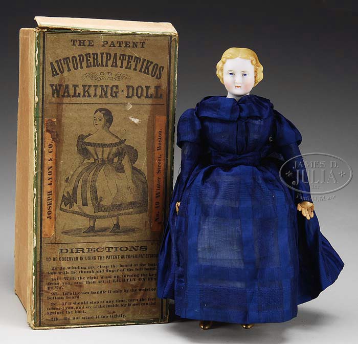 PARIAN HEADED AUTOPERIPATETIKOS W/OB. Mid 1800s, this fine clockwork toy with a Parian head is contained within its original cardboard box. Box lid shows a picture of the doll and directions for use, this example was evidently sold by Joseph Lyon & Co. Boston MA. When wound the doll would move forward slowly in a life like manner. This young lady is dressed in a blue patterned silk dress (older replacement) which complements her molded blond hair and pale coloring. SIZE: 9-1/2″ t. CONDITION: Overall very fine plus, some minor distress to box lid/flaps. 1-9413 (2,500-3,500) Auction: Advertising, Toy & Doll - Spring 2009 Please Note: All prices include the hammer price plus the buyer’s premium, which is paid by the buyer as part of the purchase price. The prices noted here after the auction are considered unofficial and do not become official until after the 46th day. |