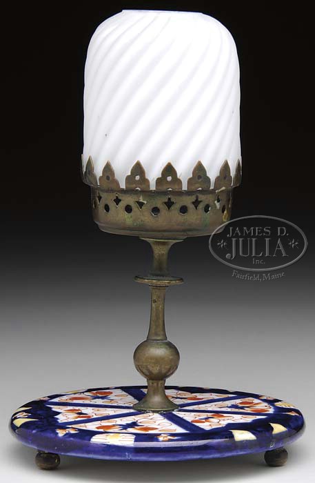 PORCELAIN BASE FAIRY LAMP. Lovely Fairy lamp has porcelain base with gaudy-style decoration which supports a brass stem and shade holder. Base supports white swirling ribbed Fairy lamp shade. Base marked on underside “2529 1/2.” SIZE: 7″ h. CONDITION: Very good with some slight roughness to top rim of shade. 5-64584 (250-350)