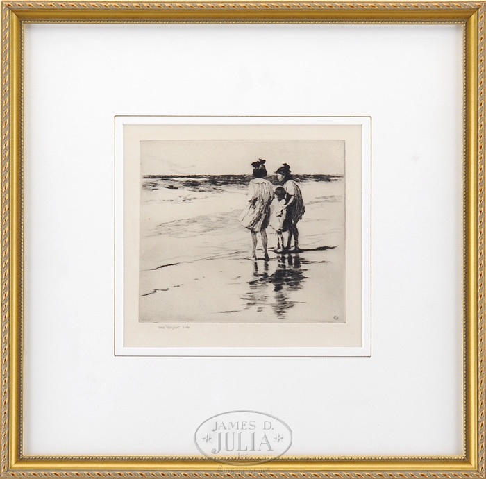 SEARS GALLAGHER (AMERICAN, 1869 – 1955) “IN THE POND”. Pencil signed etching Monhegan Island beach scene shows three children at edge of water. Pencil signed lower left. Housed in a modern gilt frame with gold liner and highlighted white mat. SIZE: Sight size: 7-1/2″ x 8″. CONDITION: Very good. 9-96929 (1,000-2,000)