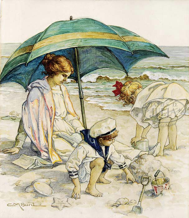 CLARA MILLER BURD (American, Early 20th Century) ON THE SEASHORE. Outstanding unframed illustration watercolor on paper mounted to board scene shows a young mother with her two children on a beach with large umbrella. The woman reads while the two children play in the sand. Signed lower left “CM Burd”. SIZE: 19-1/2″ x 16-3/4″. CONDITION: Very good. 9-98477 (3,000-5,000)