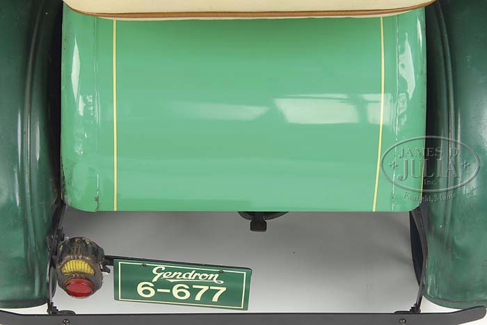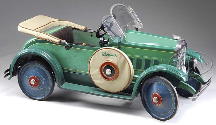 OUTSTANDING PACKARD PEDAL CAR BY GENDRON. This remarkable pedal car from the mid 1920s is as good as it gets! Highly sought after by toy collectors as well as collectors of the real life vintage Packard automobiles, this vehicle comes complete with a multitude of “options”. Known in the pedal car world as a “six footer” (almost six feet long) this car comes with an adjustable windshield with fly windows, running board spotlight, front & rear license plates, gear shift lever, taillight, simulated canvas fold down roof, canvas cover for side mount, front headlights, working horn, simulated spark advance and on/off switch for headlights on the steering wheel are just a few of the extras adorning this pedal car. Enameled in two tone green paint with gold pin striping and the trademark Packard nickel plated honeycomb radiator this was the prize possession from a west coast estate collector who had searched for years to find the best possible example of a Packard pedal car. Although some paint has been enhanced (hood, front fenders, trunk) and the fly windows are replaced, this car overall is in very fine original condition. A rare opportunity to find such a unique item to add to ones collection! SIZE: 55″ l. CONDITION: Replaced canvas covers for spare & rag top, as noted above. Overall condition is very fine. 1-11416 (6,000-8,000) Auction: Advertising, Toy & Doll - Fall 2011 Please Note: All prices include the hammer price plus the buyer’s premium, which is paid by the buyer as part of the purchase price. The prices noted here after the auction are considered unofficial and do not become official until after the 46th day. |