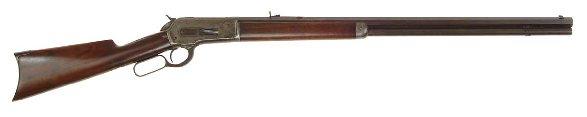 SPECIAL ORDER WINCHESTER MODEL 1886 LEVER ACTION RIFLE. Cal. 45-90. SN 104105. Standard grade rifle with special order 28″ bbl, full magazine, half-nickel front sight with screw and semi-buckhorn rear sight. It has uncheckered wood with straight stock & crescent buttplate. CONDITION: Very good. Bbl & magazine tube retain an even dark plum patina with a few light nicks & scratches and a small spot or two of light rust, a little heavier on the left side toward the muzzle. Receiver retains traces of case colors around the back of the loading gate with the balance silvered case colors mixed with dark patina. Light to moderate pitting on the left side. Lever & hammer retain traces of case colors. Wood is sound with a filled area on the forearm and others around the tang of the butt stock and retains most of a refinish. Good mechanics, bright shiny bore with a few very scattered spots of orange peel. 4-54892 (2,500-3,500)