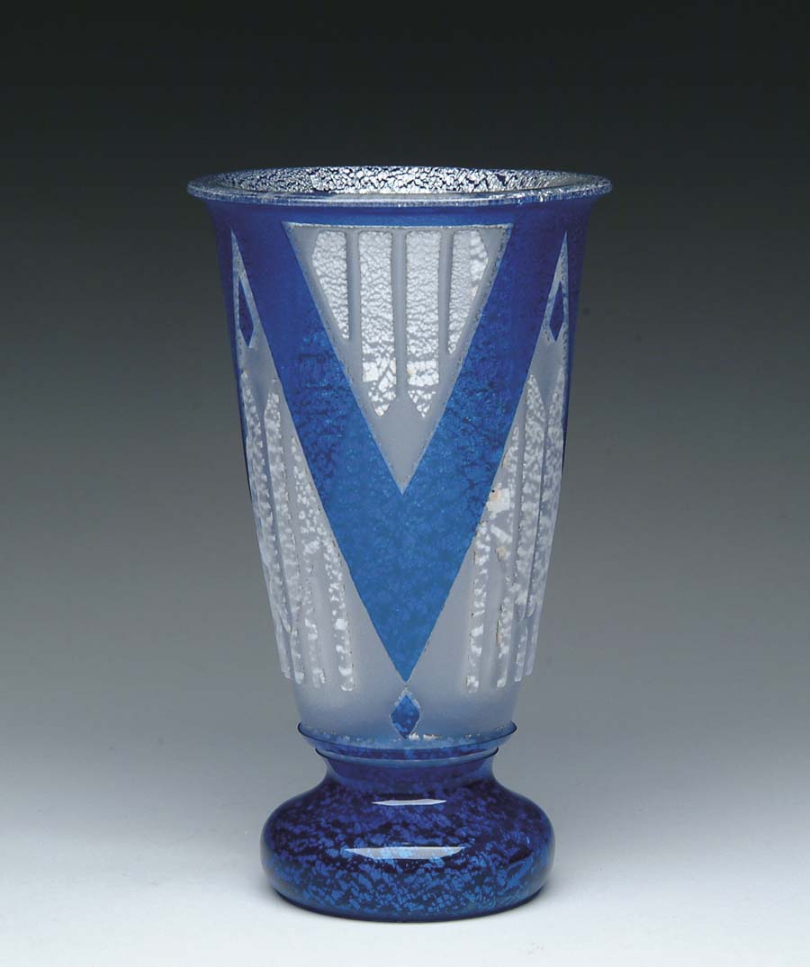 MULLER ART DECO VASE. Wonderful Art Deco vase has “V” shaped cameo design and foot in beautiful rich blue with silver foil inclusions. Background is frosted glass with frosted cameo vertical lines. Signed on the underside with lightly etched signature “Muller Fres Luneville”. SIZE: 8 in. t. CONDITION: Heat check on interior clear glass layer at the foot, does not extend to outer layer. 5-61293 (1,500-2,000)