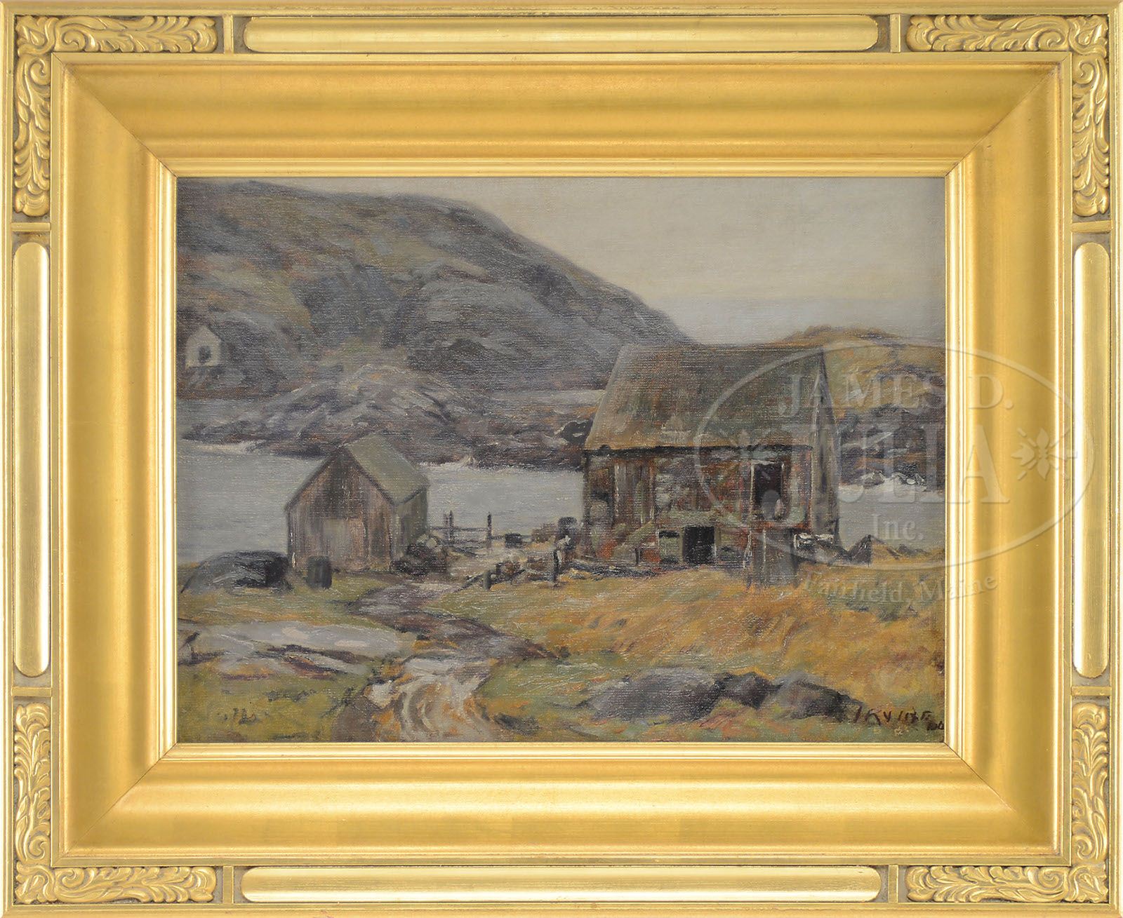 WILSON HENRY IRVINE (American 1869-1936) MONHEGAN ISLAND. Oil on canvas Housed in a contemporary gold carved frame Signed “Irvine” and dated, lower right Identified on Vose Galleries, Boston, label on verso SIZE: 18″ x 24″. Overall: 27″ x 34″. CONDITION: Very good, lined, very minor scattered inpainting. 9-28192 (4,000-6,000)