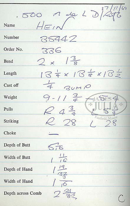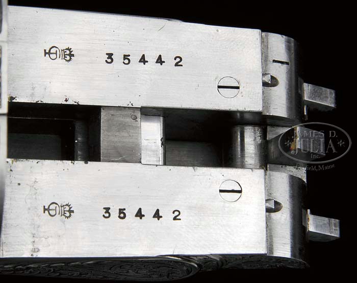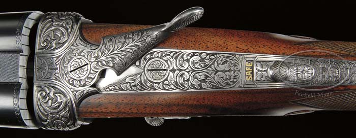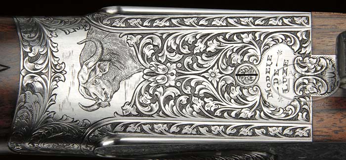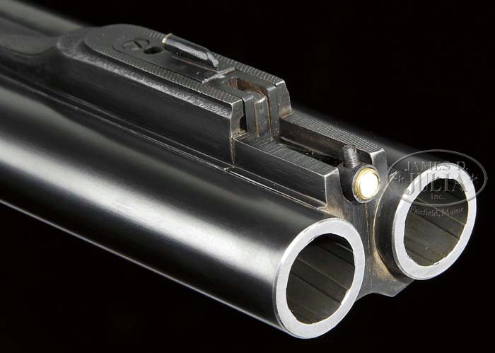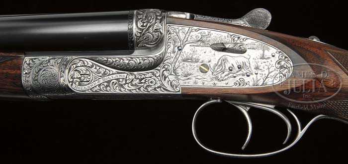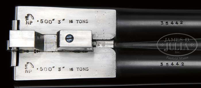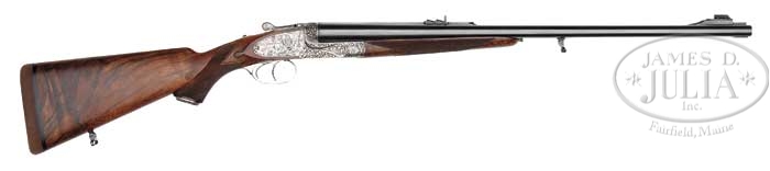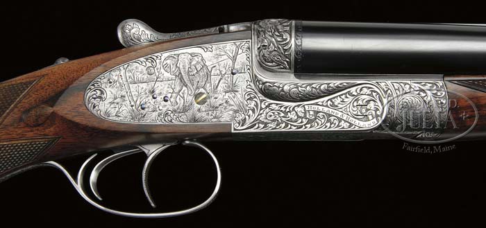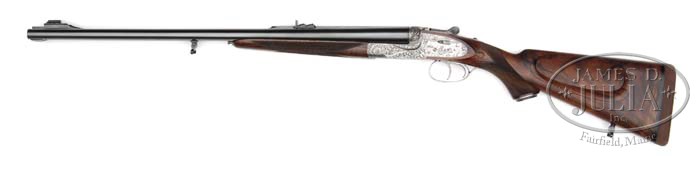 *RARE HOLLAND & HOLLAND ROYAL MODELE DELUXE DBL RIFLE WITH CASE. SN 35442. Cal. .500 NE 3″, 24″ bbls, ejectors, reinforced at muzzle, ramp fine brass bead foresight with large flip-over moon sight, hand-filed matted quarter rib with 3-leaf express sight, one standing and two folding. Top rib of bbl is marked “500 NITRO EXPRESS 3″ CASE”. Right bbl is marked “HOLLAND & HOLLAND”. Left bbl “13 BRUTON STREET, LONDON”. Bottom rib is marked “MODELE DELUXE”. Bottom rib is equipped with base and 3/4″ swivel. The reinforced coin-finished action body with in-face third fastener, hand-detachable locks, gold line indicators, extended top tang. Engraving vignettes are of a charging Rhino on left lock plate, Bull Elephant on right, and bust of Cape Buffalo on action bottom, the balance is a bold flowing foliate scroll with ribbon on each side marked “HOLLAND & HOLLAND”. The engraving is unsigned. Fences are deep chiseled foliate scroll. Trigger plate is marked “MODELE/DE/LUXE”. Extended top tang, top lever, and rolled-edge trigger guard are engraved with foliate scroll. Dbl triggers with articulated and checkered front. Mounted with nicely figured walnut, tear-drop points, checkered pistol grip, with scroll engraved grip cap with trapdoor, left side shadow-line cheekpiece, newer Old English recoil pad, stud with 3/4″ swivel, checkered splinter forend. Gun weighs 10lbs. 4oz. LOP 14-1/8″. Accompanied with Maker’s leather luggage case, green felt interior, proper trade label inside top lid with snap caps and leather muzzle cover. Brown canvas cover. The Maker’s have kindly informed that the gun was finished in 1969 as a Royal double rifle in cal.500 NE and weighing 9lbs 11 3/4oz with a 13 1/8″ LOP. PROVENANCE: Robert E. Petersen Collection CONDITION: Fine as partially refurbished. Bbls retain virtually all of their fine London quality re-blacked finish with just a couple minor, tiny handling marks. Receiver retains virtually all of its fine gray finish. Stock is sound with sharp, crisp checkering, a couple tiny handling marks, and retains all of its fine, hand-rubbed oil finish. Pad is essentially new. Forend is sound with sharp checkering, a couple small handling marks and retains its fine, hand-rubbed oil finish. Mechanics are crisp, automatic safety, strong ejectors, shiny bores with some cordite burn in grooves forward of the chambers. Case is sound with moderate wear to interior and deterioration to the label. Canvas cover shows some minor soiling, scuffing on corners and hand-written on top identifying gun and caliber w/ owner’s initials. 4-42074 BDT274 (50,000-80,000)