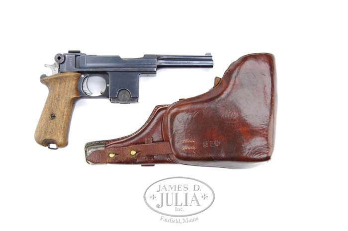 *BERGMANN MODEL 1910/21 SEMI AUTOMATIC PISTOL WITH ORIG HOLSTER. SN 11924. Cal. 9mm Bergmann. 3-7/8” ribbed bbl. Issue number 3397 is engraved on right side of receiver. Magazine number is 379. Plain walnut grips have the last three digits of SN. Brown leather holster is marked “crown / HV / 33” on front of flap with other stamping inside, unreadable. There are three graduated pouches under the flap, which has two retaining snaps. Metal tip of holster has been plated. Cleaning rod is missing. Made for the Danish army in Belgium. CONDITION: Very fine with 85% thinning blue overall. Grips show minor handling marks. Mechanically fine 4-31151 JDJ (2,000-3,000)