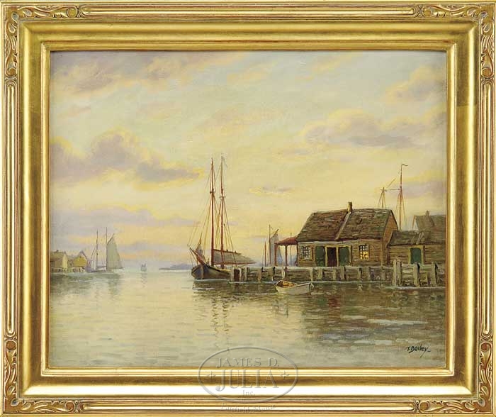 T. BAILEY (William Paskell) (American, 1866-1951) SUNSET HARBOR. Oil on canvas harbor scene shows buildings, docks and boats in a calm harbor under a sun setting sky with colorful clouds and light blue sky. Signed bottom right “T. Bailey”. Housed in a modern carved and gilt wood frame. SIZE: 16″ x 20″. CONDITION: Very good. 9-20288 (1,000-1,500)