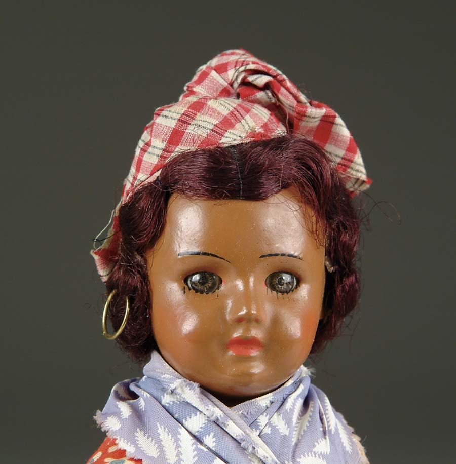 13” BROWN PAINTED BISQUE SFBJ DOLL. Brown painted bisque French doll circa 1930 with closed mouth, hazel glass stationary eyes, head incised “SFBJ PARIS 2.” On five-piece composition articulated body, wearing printed cotton dress with red plaid hat and blue print bandana around neck. Originally sold as a tourist doll to represent the French Caribbean colony. CONDITION: Very good, un-played-with condition. RS 1-3537 (100-150) Auction: Advertising, Toy & Doll - Spring 2005 Please Note: All prices include the hammer price plus the buyer’s premium, which is paid by the buyer as part of the purchase price. The prices noted here after the auction are considered unofficial and do not become official until after the 46th day. |