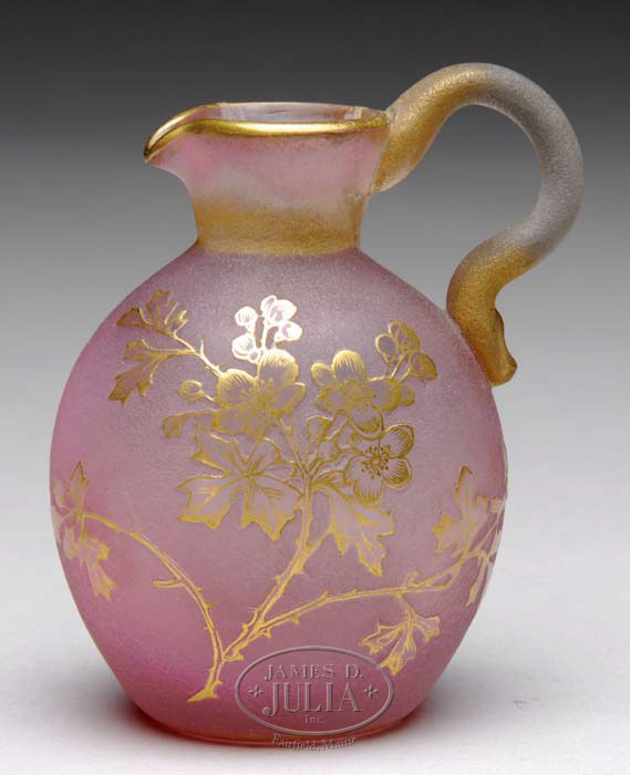 DAUM NANCY MINIATURE PITCHER Daum pitcher is decorated with cameo floral decoration on front and back and is done against an acid textured pink background and is further enhanced with gold gilt highlights. Signed on the underside in gold gilt “Daum Nancy”. SIZE: 3-1/4″ t. CONDITION: Neck and handle have been broken and repaired. 5-64946 (50-100)