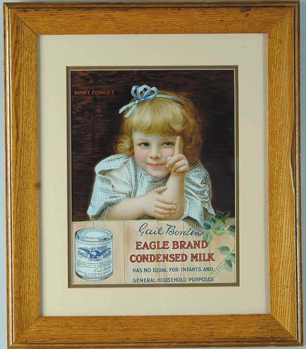 EAGLE BRAND CONDENSED MILK SIGN. Adorable stone lithograph of little girl behind wooden fence holding her forefinger aloft captioned, “Don’t Forget”. IMAGE SIZE: 9-3/4” w x 12-3/4”h. CONDITION: Excellent. 1-693 (300-500) Auction: Advertising, Toy & Doll - Fall 2003 Please Note: All prices include the hammer price plus the buyer’s premium, which is paid by the buyer as part of the purchase price. The prices noted here after the auction are considered unofficial and do not become official until after the 46th day. |