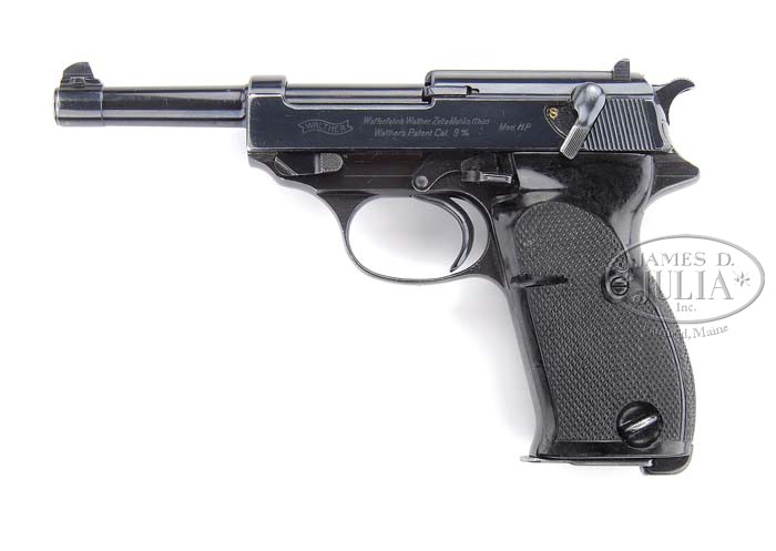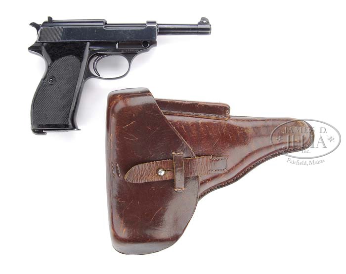 *RARE SWEDISH CONTRACT WALTHER HP SEMI-AUTO PISTOL WITH HOLSTER. SN h1281. Cal. 9mm. 4-3/4″bbl. Rare experimental first production HP for Swedish test trials. Thick front sight with wide “U” aperture fixed rear sight. Visible extractor and rectangular firing pin. Crown “N” proofs on right side of frame. Fitted with black checkered composition grips. Orig HP magazine is only three numbers off (1284). Only about 1,065 of these guns were produced and very few can be found in this condition. With proper brown leather holster. CONDITION: Very fine. Retaining about 95% orig high polished blue. All numbers match except magazine. Grips have light wear and a few chips to the checkering. Bore is sharp with light frosting. Mechanics are crisp. Magazine retains about 90% orig finish. Holster is fine with minor wear and scuffs. 4-36461 BS21 (3,500-4,500)