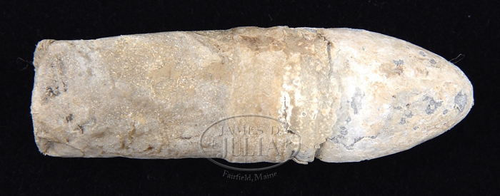 .56 CAL COLT MUSKET CARTRIDGE. Mr. Michel’s notes state this cartridge was manufactured at Selma, AL arsenal. Casing for bullet is made of gut. Mr. Michel’s Notes State: “This cartridge manufactured at Selma Arsenal. All complete and intact.” PROVENANCE: Ben Michel collection. CONDITION: 4-31442 JS73 (200-400)