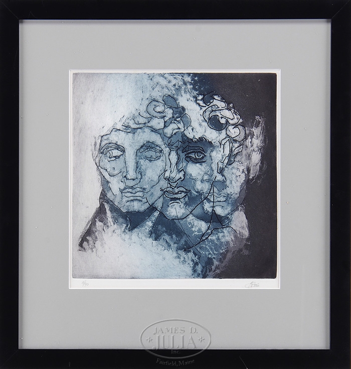 LINDA STEIN (American 1942-) THREE FACES OF MAN. Lithograph limited edition print shows three heads of men layered beside each other. One representing the masculine, one represents the feminine and the last representing the spiritual. Pencil numbered “4/90″ and signed in pencil lower right. Housed in a flat black wood frame with gray matte. Linda Stein exhibited at the Creative Gallery in NY in 1967 and had one-man shows at the Lang Gallery, NY in 1968. SIZE: Sight: 12-1/2″ x 12-1/4″. Image: 11-3/4″ x 11-3/4”. PROVENANCE: Collection of Elwyn Dearborn, Medford, NJ; Portland, ME. CONDITION: Very good to excellent. 9-96078 (400-800)