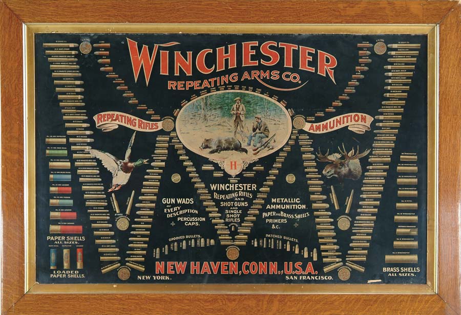 WINCHESTER MODEL 1902 DOUBLE-W CARTRIDGE BOARD. A cartridge board without cartridges produced by Winchester and rarely encountered in their orig form. It has a 49″ x 31-1/2″ image, nearly identical to the 1897 board with the addition of four more handgun cartridges and four additional rifle cartridges. The center vignette is identical with the two hunters and a dead bear while the duck has been moved to where his bill is completely visible and is referred to as the smiling duck. The moose is also slightly changed and is referred to as the contented moose. The logos and legends are virtually identical. It is mounted in its orig gold lined oak frame with the back being covered by heavy cardboard. CONDITION: Image is sharp and crisp with dark vivid colors, slightly faded on the center vignette. Frame is in extremely fine condition with only some minor corner damage. A rare and desirable board. 4-54114 JR736 (4,500-6,500)