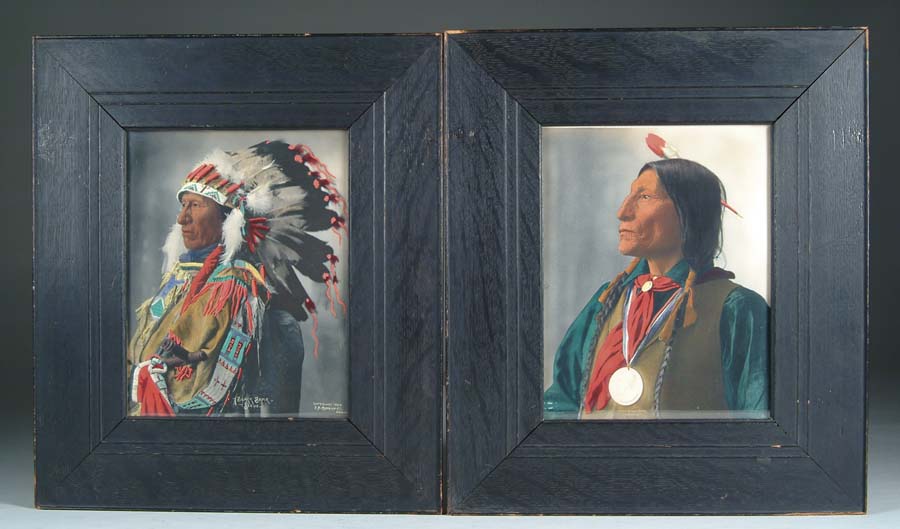 LOT OF TWO FRAMED HAND COLORED PHOTOGRAPHS OF INDIANS. Both images are 9″ x 7″, framed in wide dark oak frames. (1) Titled “Black Bear / Sioux” with copyright “1899 F.A. Rinehart, Omaha”. The image is of an Indian in colorful war bonnet with beaded buckskin shirt holding a pipe. Only part of the photo is colored in with the rest being black & white. (2) Titled “Chief Wolf Robe / Cheyenne” with copyright “1898 F.A. Rinehart, Omaha”. The image is of an Indian man with long braids and a single feather in his hair wearing a plain vest with a green shirt and red neckerchief with a slide. He also has a peace medal on a ribbon around his neck. The entire image is hand colored. CONDITION: Both photos seem to be in fine condition as are the frames. 4-54525 4-54526 JR433 (200-400)