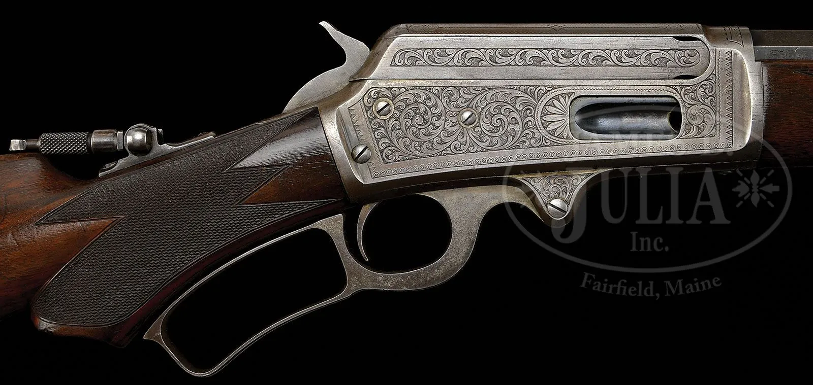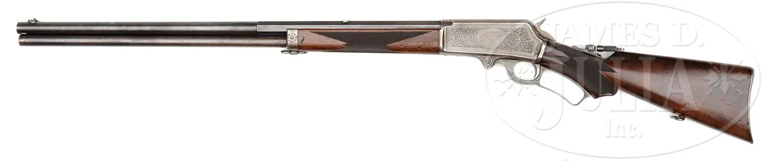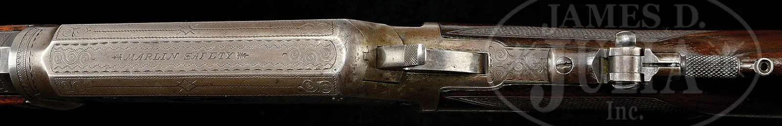 SCARCE DELUXE ENGRAVED MARLIN MODEL 1895 LEVER ACTION RIFLE. SN 137323. Cal. 45-90. Special order deluxe engraved ’95 Marlin with 26″ special order oct to rnd bbl, full magazine, Beach’s combination front sight, slot blank in rear seat and Lyman tang sight, missing its disk. Mounted with nicely figured, slab sawed American walnut with B-style checkered forearm and serpentine grip buttstock with Marlin semi-crescent steel buttplate. Buttstock and forend cap have factory sling loops. Receiver is very nicely engraved in #5-style by Conrad Ulrich, which consists of the oval vignette of a bull and cow elk on the left side, surrounded by foliate arabesque patterns and distinctive border patterns. Right side has matching foliate arabesque patterns and borders. Matching engraving extends onto the side of the bolt, bottom and top of receiver lever boss and top tang. Matching engraving patterns extend about 2-3/4″ over the chamber area of the exposed flats of the bbl. Buttplate is most unusually engraved in diamond and dot patterns with wavelet borders. Left side of upper tang, under the wood, is marked with matching SN, which is also found in top tang channel of buttstock and inside the buttplate. The Model 1895 is one of the more scarce Marlins with only about 18,000 produced in the period 1895-1917 in 7 different calibers, both standard and deluxe rifles and carbines. Engraved rifles in this model are quite rare. CONDITION: Fine to very fine, all matching. Bbl and magazine tube retain thin blue turning more silver on the magazine tube. Receiver has two extra holes on the left side. Receiver retains traces of case colors, mostly having turned silver. Wood is sound with a few light nicks & scratches and a couple heavier bruises on forearm and overall retains about all of a restored finish with freshened checkering. Mechanics are fine, strong bore with good shine, dark in the grooves. 4-49345 JR253 (4,000-6,000)