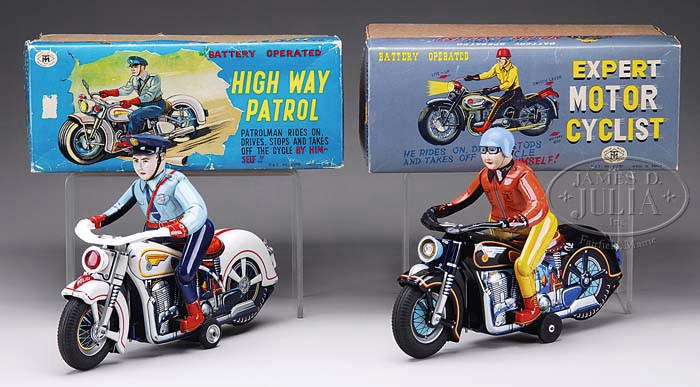 TWO FABULOUS LARGE MOTORCYCLES IN ORIGINAL BOXES. Modern Toys, Japan. 1) Battery operated Highway Patrolman. Tin v-twin police cycle rolls forward, stops as uniformed officer dismounts, remounts and takes off again! Impressive toy with highly embossed engine detail, solid rubber tires and working red headlight. With original instruction sheet and colorful box images. 2) Battery operated Expert Motor Cyclist. All tin Harley dude jumps on board v-twin cycle marked “Atom” and motors forward. Engine idles as he comes to a stop and dismounts. Working head lamp. Knockout toy with original string neck tag instructions and packing material! Box is highly graphic. SIZE: 11-1/2″ l each. CONDITION: Highway patrolman needs a leg adjustment for full operation, otherwise near excellent toy and box. Expert Motor Cyclist has all functions working. Box and toy are excellent to near mint. 1-9267 (1,000-1,500) Auction: Advertising, Toy & Doll - Spring 2009 Please Note: All prices include the hammer price plus the buyer’s premium, which is paid by the buyer as part of the purchase price. The prices noted here after the auction are considered unofficial and do not become official until after the 46th day. |
