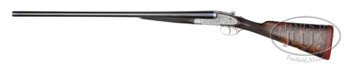 *HOLLAND & HOLLAND ROYAL HAMMERLESS EJECTOR HEAVY GAME GUN. SN 15747. (ca 1910) Cal. 12 ga. 28″ Dovetailed bbls fitted with sunken narrow game rib are engraved with H & H New Bond Street address on tops of each bbl. Bbl flats are stamped with London nitro proofs for .750 grain bullet and “R. choke”, and London re-proofs for 1-1/4 oz of shot, and 2-3/4″ chambers. Bottoms of bbls are stamped with SNs. Holland Royal sidelock action is stocked to the fences and features long top tang extending over comb, automatic safety (SAFE inlaid in gold), double triggers (front trigger “loose”), and gold band tumbler end cocking indicators. Action and locks are engraved with exceptionally well cut large open shaded acanthus scroll in H & H house style, with “Holland & Holland” in classic device on each lockplate. Bottom of action is engraved “Royal Hammerless Ejector” and top lever “Patent Ejector”. Matching trigger guard has SN on grip of short tang. Beautifully marbled and strikingly figured European walnut straight grip buttstock measures 14-1/2″ over red stained leather covered pad, and features drop points, diamond hand, classic 22 LPI checkering with mullered borders, and a vacant gold oval on toe line. Matching splinter ejector forend has Anson release. Bore diameter: left-.743, right -.741. Bore restrictions: left -.011, right -.006. Wall thickness: left -.022, right -.026. Drop at heel: 2-1/4″, drop at comb: 1-1/2″. Weight: 7 lbs. 6 oz. LOP: 14-1/2″. Tan leather case with glued on corners is lined in burgundy cloth and contains a pair of snap caps and an oil bottle marked “Made in England”. CONDITION: Fine as refurbished. This fine gun was converted from a Paradox to a heavy game gun with new ribs being laid. Bbls retain most of a finely done black. Action has been coin finished and remains a pleasing gray. Stocks retain most of a well done oil refinish, over some minor marks. Pad is relatively new, checkering lightly re-cut. Bores are very fine, slightly frosted. Action is tight. Bbls are on face. Ejectors are slightly out of time. Case is excellent. 4-46027 MGM310 (8,000-12,000)