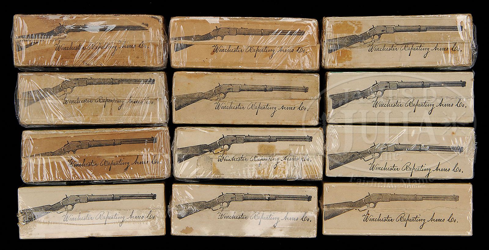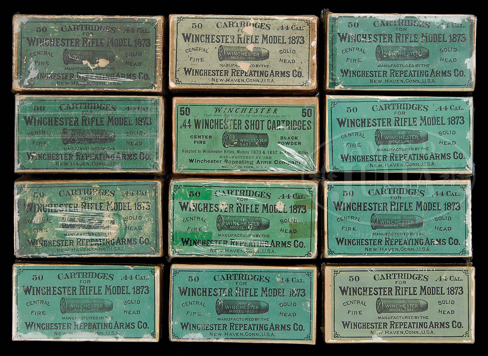 LOT OF SIX BOXES OF WINCHESTER MODEL 1873 44 WCF CARTRIDGES; ONE BOX 44 WCF SHOT CARTRIDGES; AND SIX EMPTY BOXES. 1) One sealed box 44 Winchester shot cartridges, green top label and orange band, marked on end “SHOT CARTRIDGES / 44 WINCHESTER / NO. 8 SHOT” over a large red “W”. 2) Six full sealed boxes of 44 WCF cartridges with green labels and buff colored bands with a Model 1873 carbine on one side. 3) Six empty boxes, identical to the six full boxes. PROVENANCE: Wes Adams Estate Collection. CONDITION: 1) Very good to fine, box is completely intact with lightly faded and soiled top label, showing a couple spots of wear. Orange band is moderately to heavily faded. Box is heavily yellowed. 2) Boxes appear to be all identical with one showing moderate to heavy fading on top label, the other five very light fading and all six showing light wear and soil. 3) Two of the empty boxes appear to be complete with light to heavy soil and tape on one of them, and the other is missing about 15% of its band. The other four boxes are each missing an end flap, three from the top and one from the bottom. All show light to heavy wear and light to moderate soil. All boxes are sealed in plastic and the cartridges were not checked. 4-44885-4 JR79 (2,500-4,000)