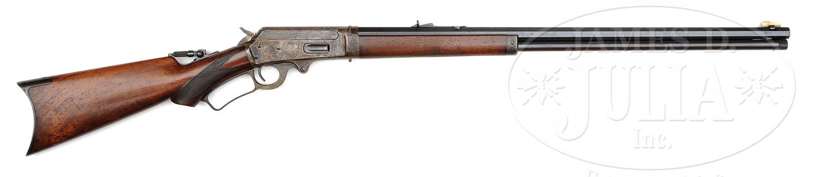 FINE ENGRAVED DELUXE MARLIN MODEL 1893 TAKEDOWN LEVER ACTION RIFLE. SN 211540. Cal. 30-30. Beautiful antique rifle with 26″ oct bbl, full magazine with German silver Rocky Mtn. front sight, Marlin semi-buckhorn rear sight & Lyman combination tang sight. Top flat of bbl has standard markings with caliber marking over chamber area and left top side flat is marked “SPECIAL SMOKELESS STEEL”. Top of receiver is marked “MARLIN SAFETY” and top tang is marked “MARLIN 1893”. Mounted with very nicely figured American walnut with A-style checkered forearm and serpentine grip buttstock with crescent buttplate. Left side of upper tang, under the wood, is marked with matching SN which is also found in top tang channel of buttstock and inside buttplate. Receiver is very nicely engraved in #2 style by Conrad Ulrich with the vignette of a running whitetail buck on left side and small vignette of a standing whitetail buck on right side, both in very detailed scenes. Both sides are surrounded by foliate arabesque patterns which extend over top & bottom of receiver on to the lever boss, takedown ring and about 2″ over chamber area of the bbl. Forend cap also has small patterns on each side. These early Marlins, regardless of their configuration, are rarely found with high orig finish. They were produced in a period of a hunting culture where they were exposed to the ultra-violet rays of sunlight which rapidly fades case colors. They usually saw hard service. CONDITION: Fine. Bbl retains 96-97% strong orig blue with only faint sharp edge wear and a few scattered spots of surface rust; magazine tube is mainly a blue/brown patina with strong blue in sheltered areas; receiver retains 50-60% orig case colors, strong & bright in sheltered areas, moderately faded on left side and heavily faded on right side; lever & hammer retain strong case colors on sides, turned silver on outer faces of lever; takedown ring & forend cap retain faded case colors and the buttplate is mostly faded to a dark patina. Forearm has a couple of gouges on bottom, otherwise wood is sound with buttstock retaining 85-90% orig varnish showing moderate wear on checkering; forearm shows very heavy wear and retains a restored finish. Mechanics are fine, strong, sharp bore, frosty in the grooves. 4-49510 JR405 (4,500-7,500)