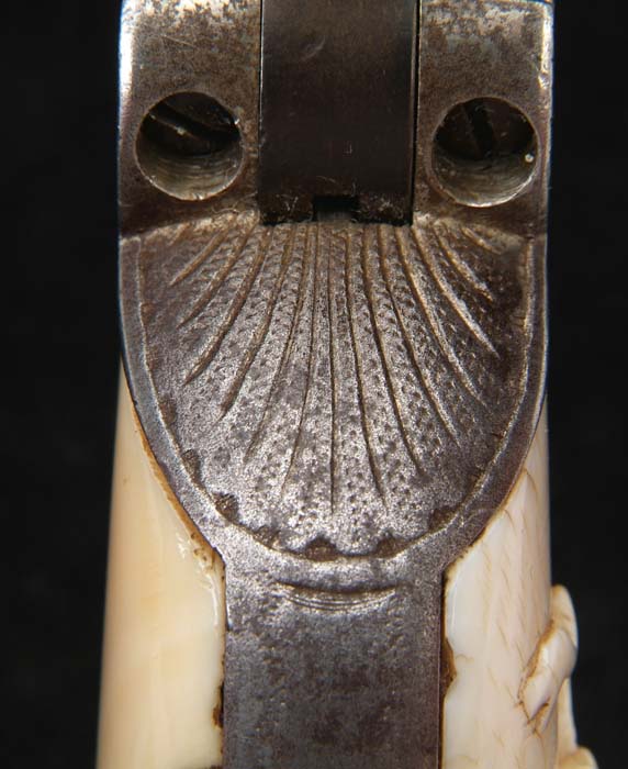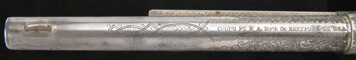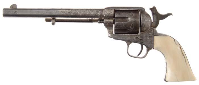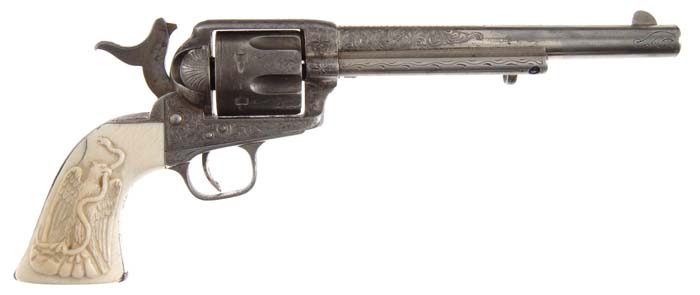 ENGRAVED RIMFIRE COLT SINGLE ACTION ARMY REVOLVER. Cal. 44 RF Henry. SN 1458. One of only about 1,800 of these revolvers, made in period 1875-1880. It has nickel finish, 7-1/2” bbl, 1-line block letter address with 3-line patent dates on left side of frame and 1-pc ivory grip with deep relief carved Mexican eagle holding a snake on right side. It is engraved by L.D. Nimschke with foliate arabesque patterns on frame & sides of bbl with Nimschke’s trademark fan at top of backstrap. There are arabesque patterns on top of bbl with a wavy line & star engraving patterns on top strap. The backstrap, butt strap & triggerguard have light arabesque patterns. This revolver is virtually identical to another rimfire revolver from the Buddy Hackett Collection. Accompanied by a Colt Factory letter identifying this revolver with blue finish & wood grips shipped to J.P. Moores Sons, New York, NY, Oct. 1, 1878 in a shipment of eight same-type guns. It is well known that Moores was a major customer for the Nimschke Engraving Shop, leaving little doubt that this revolver was engraved before it was sold. Given its current configuration it undoubtedly saw service in Mexico. CONDITION: Very good to fine, all matching except cyl which is numbered “149”. Overall retains about 30% nickel finish with balance a gray metal color with some very fine pitting, particularly on sides of bbl and front sides of frame. Grip has a couple of cracks along back edge with a minor chipped toe and numerous age lines and retains a beautiful mellow patina. Base pin is a replacement. Will not hold at half cock or safety notch, otherwise mechanics are fine, strong bright bore. 4-30627 JR295 (20,000-30,000)