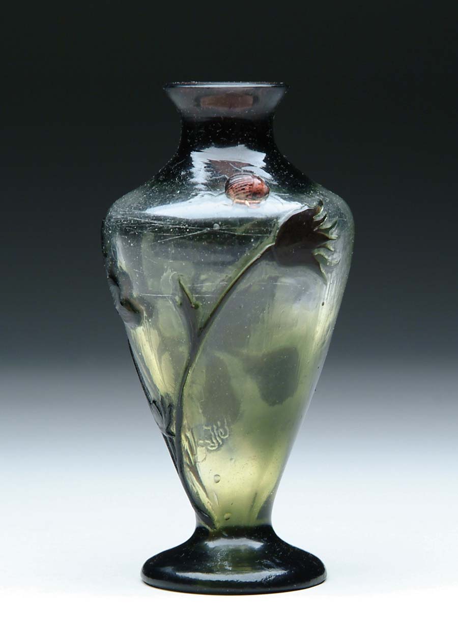 GALLE WHEELCARVED VASE. Exceptional Galle vase has wheelcarved smoky purple flowers, leaves and stems against a background of green shading to clear. Shoulder of the vase is set with a cabochon ladybug with legs and feelers etched into the vase. Signed on the side with engraved signature “Galle”. SIZE: 6 in. t. CONDITION: Some minor scratches to interior of vase, otherwise very good to excellent. 5-61098 (4,000-6,000)