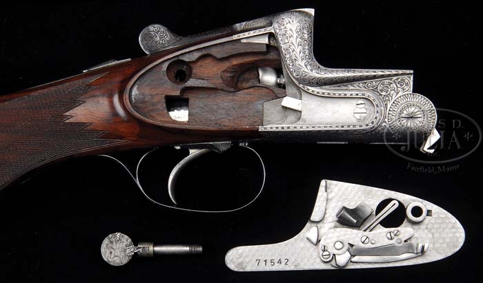 *GERBRUDER MERKEL 303 E DETACHABLE SIDELOCK EJECTOR OVER-UNDER GAME GUN WITH EXTRA BARRELS AND CASE. SN 71542. Cal. 20 Ga. 26″ and 28″ Barrels with matted ventilated ribs are marked “Gerbruder Merkel, Suhl” and “Made in Germany” on bolsters, with triangles of open shaded scroll at breech ends. Bottoms of bbls have German Nitro proofs with proof date 4/ 69 with SN and “Bohler Stahl Weichlot” on both sets. Top extractors are stamped “70” on 26″ bbls, and “76” (3″ chambers) on 28″ bbls. Coin finish hand detachable sidelock double Kersten action has non-automatic safety, and selective single trigger (selector on trigger plate). Action is engraved with full coverage of nicely executed shaded open scroll with “Gerbruder Merkel” on riband on bottom. Lockplates are relief engraved with dog pointing group of pheasants in woodland with one pheasant in flight, on the right side. Left lock depicts a fox with prize of grouse (?) in his mouth, and another 5 flushing in front of him in open woodland. Steel trigger guard has matching scroll on bow and pointed tang. Stump figure nicely marbled European walnut semi-pistol grip buttstock measures 14-9/16″ over checkered horn buttplate, and features 28 LPI point pattern checkering with line border. Matching 3-pc forend has Deeley release. 26″ Barrels: Bore diameter: top -.624, bottom -.624. Bore restrictions: top -.016, bottom -.004. Wall thickness: top -.042, bottom -.044. Drop at heel: 2-1/4″, drop at comb: 1-1/2″. Weight: 6 lbs. 12.8 oz, LOP 14-9/16″. 28″ Bbls: Bore diameter: top -.626, bottom -.627. Bore restrictions: top -.023, bottom -.018. Wall thickness: top -.045, bottom -.035. Drop at heel: 2-3/16″, drop at comb: 1-1/4″. Weight: 6 lbs. 14 oz. Mahogany and leather case with brass corners and hardware has circular brass medallion on lid. Interior is lined in greenish-blue cloth with Merkel embroidered patch on inside of lid. Accessories include Pachmayr snap caps, round oil bottle, spare mainsprings, and W. Glaser bench cloth. CONDITION: Excellent. Bbls retain virtually all of their orig blue. Action retains most of its coin finish, with an area of slight darkening on bottom. Breech faces show marks from assembly and dis-assembly, and evidence of having been fired. Stocks are excellent with all of their oil finish, with a few very minor marks from use. Action is tight. Bbls are on face. Ejectors are in time. Trigger works well. Bores are excellent with no visible imperfections. Case is fine with scuffs and marks in leather. Straps and handle are strong. Interior has some slight soiling from contact with gun. 4-38114 MGM108 (17,500-22,500)