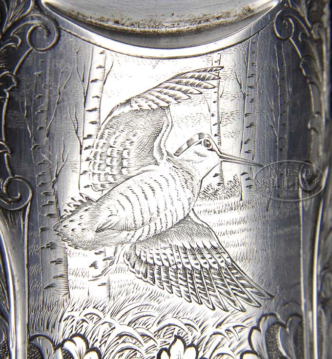 *HOLLOWAY & NAUGHTON OVER UNDER PROTOTYPE PREMIER RANGE GAME GUN WITH CASE. SN H & N 000. Cal. 12 ga. 3″ Chambers. 28″ Demi-block barrels are engraved “Holloway & Naughton England” on top of matted flat ventilated rib. Left side of top bbl is engraved “Prototype”. Bottoms of bbls are stamped with 1997 London nitro proofs for 3″ chambers and are engraved “CTISS, Dulles VA” (Importer). Coin finished sidelock Boss type OU action is fitted with non-automatic safety and non-selective single trigger. SAFE is inlaid in gold. Pins are blued. Tumbler ends have gold line cocking indicators. Action and lockplates are engraved with beautifully cut and finely stipple shaded semi-relief open scrolled acanthus as background for lifelike Bulino scenes of game birds, with a pair of cock pheasant flushing from hillside on left lockplate; a pair of chukar partridge flying over open prairie on right; and woodcock flitting through birches on bottom of action. “H. & N” is inlaid in gold in forend iron recess on bottom of action. “Holloway & Naughton” is in gold on bottom of each lockplate. Single beaded relief engraved small bow trigger guard has SN inlaid in gold on tang, which extends to small horn grip cap. Spectacular, beautifully marbled and lightly figured Circassian walnut long capped “Prince of Wales” grip buttstock measures 15-1/16″ over checkered wood butt, and features classic 24 LPI point pattern checkering with mullered borders, drop points, and vacant gold oval on toe line. Matching full forend has Boss ejector shaped reinforcing piece integral with iron, and fastens to bbl with modified Anson type release. Bore diameter: top -.730, bottom -.732. Bore restrictions: top -.029, bottom -.020. Wall thickness: top-.033, bottom -.029. Drop at heel: 2-1/4″, drop at comb: 1-5/16″. Weight: 7 lbs. 5 oz. LOP 15-1/16″. Fine quality leather toe under case with stitched leather corners is lined with maroon cloth with black leather gold embossed makers label in lid. Case contains Holloway & Naughton marked snap caps, oil bottle, and ebony and German silver 2-pc cleaning rod. There are two tan leather wallets, one with 3 H & N marked ebony handled turnscrews; the other containing cleaning brush, mop and jag. Case has maroon canvas leather trimmed outer cover with snap closure. PROVENANCE: Factory 2004 import invoice valuing the gun at 22,000 pounds CIF to Wash DC. Copies of full color H & N advertising handbills featuring this exact gun and a 2007 catalog. CONDITION: Excellent, retaining nearly all of its orig finish, showing very little use or wear. High edges of bbl are slightly silvered, and there are a few minor marks in finish of wood. Case leather is excellent. Interior cloth shows a few marks and compressions. Accessories and outer cover are excellent. A new Premier Range over under starts at 60.000 pounds. 4-45039 MGM197 (20,000-30,000)