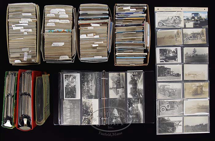 POSTCARD COLLECTION. Estate collection including four shoeboxes full of loose postcards (three of which are separated into states) One box with greeting cards. Mostly first quarter of the 20th Century. Approximately 2000 cards. Also included are five albums as follows: Album 1) Claremont, New Hampshire, approximately 250 cards with some photo cards included. Also, at the end of the album are some photographs of the area. Album 2) Central New Hampshire and Vermont cards including picture cards, 150+. Album 3) New Hampshire, approximately 200. Album 4) Miscellaneous album of Washington D.C., approximately 125 cards. And a loose album of car related post cards, approximately 200. CONDITION: Generally very good. 9-93726 (1,000-2,000)