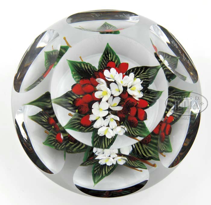 RICK AYOTTE CHRISTMAS BOUQUET PAPERWEIGHT. Bouquet consists of white and yellow blossoms with red berries and green variegated leaves. There are six side facets and one top facets. Signed on the underside and dated “91” and “Ed/50”. SIZE: 3-1/2″ dia x 2″ t. CONDITION: Very good to excellent. 5-61616 (700-1,000)