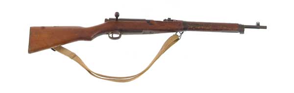 *JAPANESE TYPE 38 CARBINE. Cal. 6.5 JAP. Standard carbine with 19” bbl, one-piece stock with hand guard and canvas sling with dust cover. SN 85728. CONDITION: Fine. Good strong blue, slightly battered wood, missing wiping rod, rusty dust cover, bolt handle and buttplate. Strong dark bore. 3-30039 JR543 (100-200)