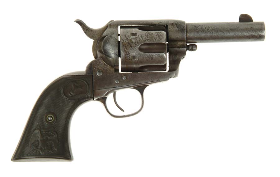 RARE COLT SINGLE ACTION ARMY SHERIFF’S MODEL. Cal. 45 Colt. SN 109923. Very rare sheriff’s model with 3-1/2″ bbl, 2-line address, black powder frame with 2-pc rampant Colt eagle hard rubber grips. Accompanied by a Colt Factory letter identifying this revolver and indicating that it was shipped April 13, 1885 to Hibbard, Spencer, Bartlett & Co., Chicago, IL as part of a 2-gun shipment. CONDITION: Very good. Traces of orig finish remain in the very sheltered areas being mostly an even light to medium gray patina. Right side of the bbl and a corresponding area on the front of the frame, cylinder and loading gate have an etched cloth pattern, apparently where it rested in or on a piece of cloth in a very damp area. Light pitting on the left side of the muzzle, on the cylinder and recoil shield. Screws have slipped edges. Grips show moderate to heavy wear primarily on the right side, which is turning chocolate. Bottom of the right grip has five, small, crude “X”‘s, apparently cut with knifepoint. Mechanics need attention, will not hold on safety notch and has no half cock. Bright shiny bore with some very fine pitting. 4-55043 JR717 (25,000-35,000)
