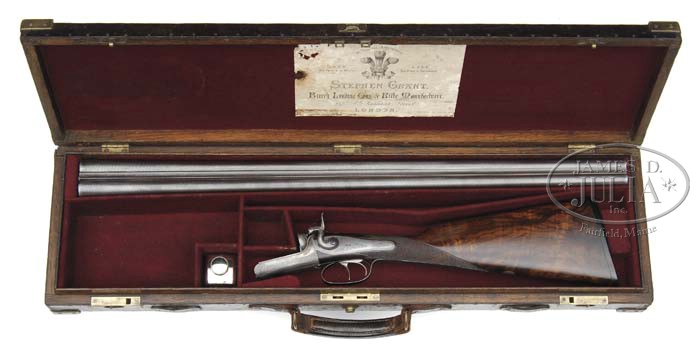 STEPHEN GRANT BEST QUALITY SIDE LEVER BACK ACTION HAMMER GAME GUN WITH CASE. SN 4272. (ca.1877) Cal. 12 ga. 2-1/2″ Chambers. 30″ Fine Damascus barrels. Gun no. 2 of a pair, and so marked on trigger guard tang, forend iron, and on medium concave game rib, which is also engraved “Stephen Grant 67a St James’s Street London”. Bbl flats are stamped with London black powder proofs. Bottoms of bbls are stamped with SNs, and bbl makers initials “HW”. Sleek round bar action is fitted with Hodges patent sliding triple bite (marked on water table), actuated by right mounted side lever. Fences are beautifully filed in typical Grant manner. Back action rebounding peninsula side locks are fitted with round bodied, high spurred, serpentine hammers. All metal parts are engraved with about 70% coverage of exceptionally well cut, small, shaded scroll. “Stephen Grant” is on each lockplate, and “Stephen Grant’s Patent” is on both sides of action bar. Scroll engraved long tang trigger guard has SN at grip. Very nicely marbled and figured Circassian walnut straight grip buttstock measures 14-1/4″ over thick hard rubber checkered buttplate. Classic point pattern flat top 20 LPI checkering has mullered borders. Matching splinter forend has Anson type release. Bore diameter: left -.732, right -.734. Bore restrictions: left -.000, right -.000 . Wall thickness: left -.028, right -.026. Drop at heel: 2-1/4″, drop at comb: 1-3/8″. Weight: 6 lbs. 12 oz. LOP 14-1/4″. Maker’s oak and leather case has brass corners and two sliding locks. Lid is embossed “L. A. B.” Case is lined with burgundy cloth, with orig paper Grant label, and contains unmarked nickel-plated oil bottle. CONDITION: Fine. Bbls retain 60 – 70% of what appears to be orig brown, but is most likely an old re-brown, thinning and silvering over all, with very pleasing definition to Damascus pattern. Action and lockplates have traces of orig case color in protected areas, and are mostly silver gray. Side lever retains most of what appears an old and correct charcoal re-blue. Trigger guard was done at the same time, and retains about 50% blue on bow. Grip is silvered with engraving washed. Stocks retain nearly all of an older oil refinish, over numerous marks and scratches. Checkering has been correctly re-cut. Action is very tight and bbls are on face, showing evidence of a recent very professional re-joint. Bores are very fine, bright and shiny, with some pinprick pitting evident toward breeches, and a few very minor pings toward muzzles. Locks are crisp. Case leather is considerably darkened, with many old scuffs and marks. Interior cloth is fine with some compressions and rubs through from contact with gun and bbls. Label is good, again showing contact marks, some rubbed through, and considerable insect damage. Oil bottle is near new. A very fine, classic, best quality hammer gun. 4-42675 MGM1 (8,000-12,000)