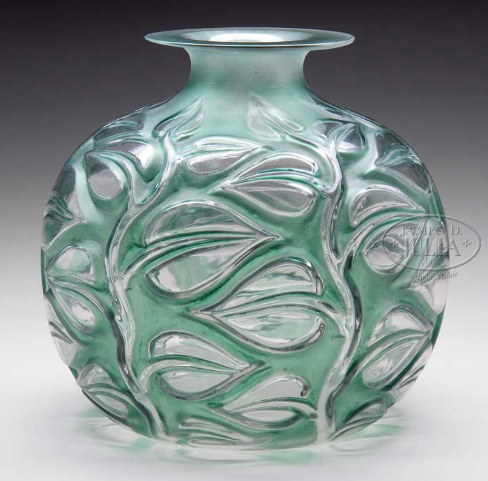 R. LALIQUE SOPHORA VASE. Clear glass R. Lalique vase in the Sophora pattern depicts deeply impressed leaves and stems encircling the entire bulbous body of the vase. The low areas are highlighted with a green patination. Signed on the underside with etched block letters “R. Lalique”. SIZE: 10″ t. CONDITION: Very good to excellent. 5-69217 (3,000-3,500)