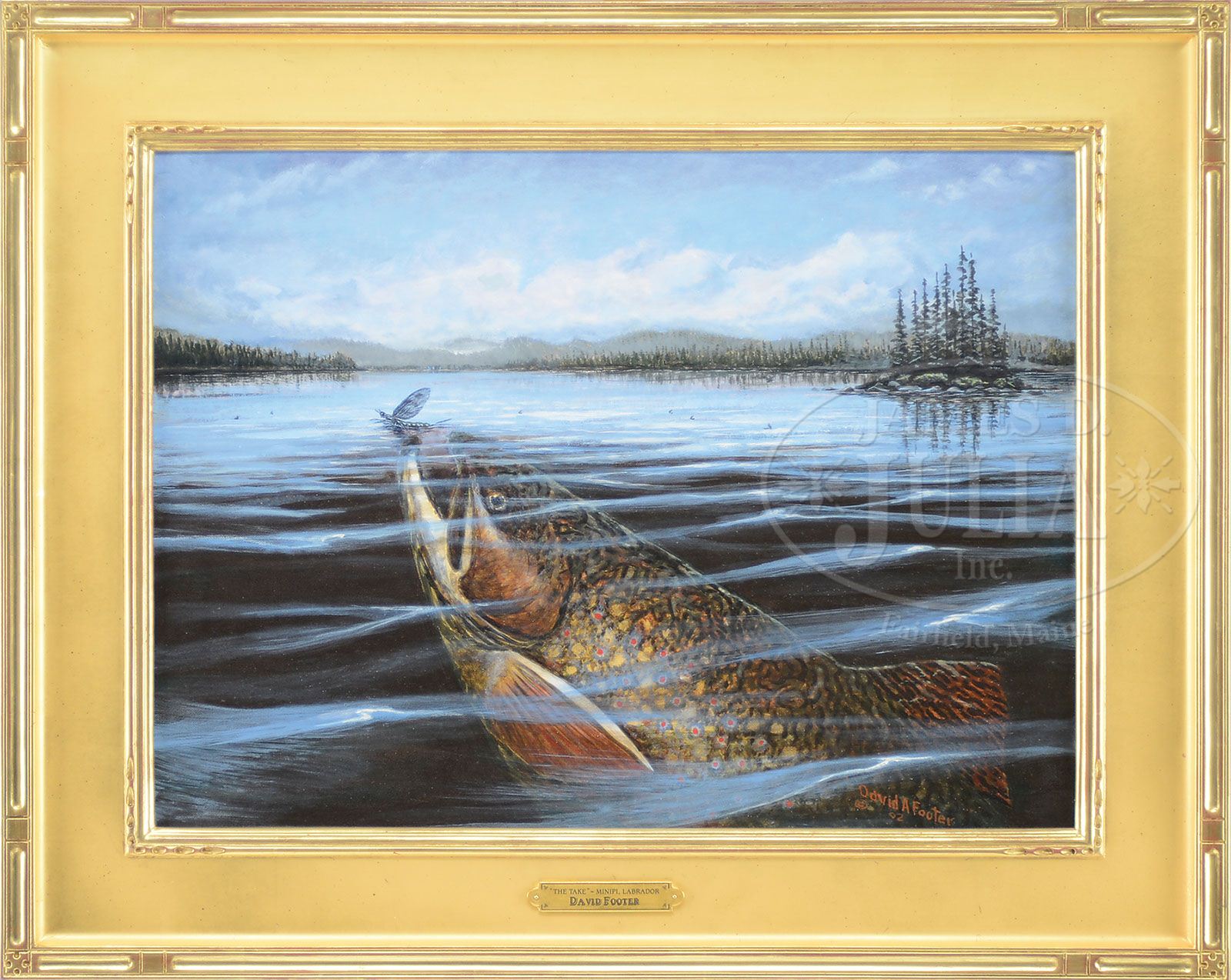 DAVID A. FOOTER (American, b. 1931) “THE TAKE” MINIPI, LABRADOR. Oil on canvas Housed in a contemporary gold carved frame Signed and dated “David A. Footer ’02”, lower right Identified as number “428” on artist’s label on verso SIZE: 18″ x 24″. Overall: 25″ x 31″. CONDITION: Very good. 9-28191 (2,000-4,000)