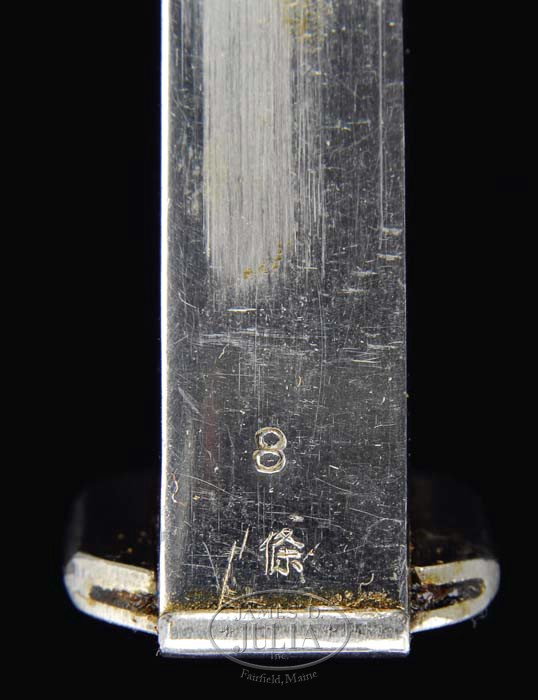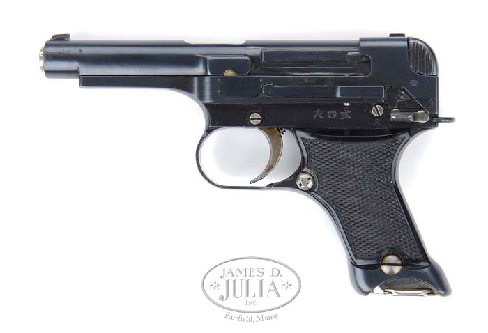 *EXTREMELY RARE JAPANESE TYPE 94 SEMI-AUTO PISTOL. SN 8. Cal. 8 mm Nambu. Extremely rare Type 94 pistol with blue finish, 4″ bbl & checkered black composition grips. It has Japanese characters on left side of frame & slide with Nagoya arsenal mark & other Japanese characters on right side. It also has production date code “10.6” & sgl digit serial number. Accompanied by an all nickel matching numbered magazine & an orig russet brown leather holster with nickel snap cover. PROVENANCE: Dr. Frank Miller Estate Collection. CONDITION: Extraordinarily fine, appears to be new & unfired. Retains virtually all of its strong orig commercial type finish with only light spots of rust on left front end of slide. Grips are crisp showing no wear. Magazine is also crisp. Holster is extremely fine with a few nicks & scratches, missing straps. Mechanics are crisp, brilliant shiny bore. 4-36217 JR304 (3,000-5,000)