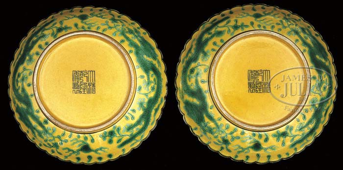 PAIR OF QING DYNASTY YELLOW ENAMEL SMALL DEEP DISHES. 19th century. Each with a 6 character Qianlong (1736-1795) reign mark in underglaze black. Each dish decorated with a central 5-toe dragon in green enamel within a leafy rondel, the borders decorated with opposing running dragons amidst leafy vinery, all in green enamel. Each dish with scalloped edge. The exterior also decorated with running dragons. SIZE: 1″ h x 5-1/4″ dia. PROVENANCE: From the Private Collection of the Grand Niece of the Last Emperor Puyi (Reign 1906-1917) of the Qing Dynasty. Granddaughter of Puji and Great-Great Granddaughter of the Dowager Empress Cixi (Reign 1861-1908). CONDITION: Very good. 9-22145 (3,000-5,000)