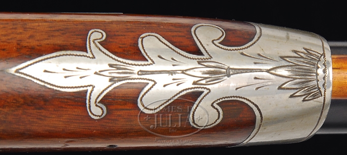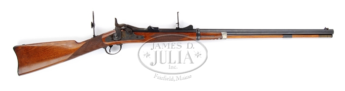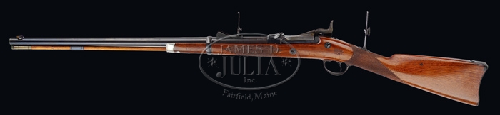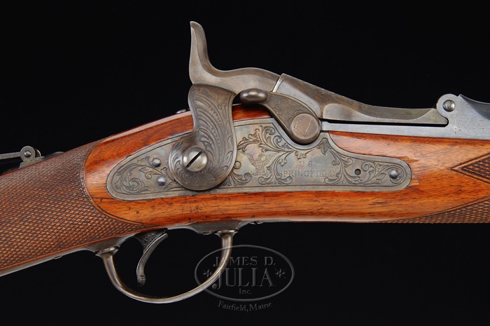 RARE SPRINGFIELD MODEL 1875 3RD TYPE OFFICER’S TRAPDOOR RIFLE. SN NSN. Cal. 45-70. Beautiful officer’s rifle with 26″ tapered rnd bbl, Beach’s front sight with ski jump rifle ladder rear sight. It has low arch “1873” marked breech block with later lockplate markings without date. Mounted in a nicely figured, checkered American walnut stock with squared pewter forend cap with leaf patterns down the bottom, a sgl band retained with spring keeper and straight grip with smooth steel carbine/rifle buttplate without trap. Top of wrist has a mid-range tang sight. Front flat of receiver, breech block, top tang, thumb latch, hammer, lockplate, trigger guard, bbl band, buttplate tang & pewter forestock inlay are all very nicely engraved. Bbl has a sgl iron guide containing the orig hickory cleaning rod with unplated brass tips. It has a 2-pc trigger guard with a serrated single-set trigger. Left side of wrist has a rectangular “SWP” cartouche with date “1885”. CONDITION: Very fine. Bbl & band retain most of their orig blue with some very fine freckles of light rust. Ramrod guide has bright blue as does the receiver. Breech block retains brilliant case colors in sheltered areas, moderately faded on top. Lockplate retains very strong, bright case colors and hammer dark case colors. Trigger guard is a blue/brown patina with light freckles of rust on tang. Buttplate retains 75-80% orig blue with some light surface rust. Wood is sound with fine handling & storage marks and retains most of its orig bright varnish. Mechanics are crisp, brilliant shiny bore. 4-31762 JR169 (17,500-25,000)
