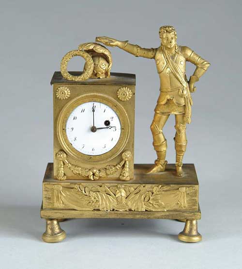 MINIATURE EMPIRE CLOCK WITH NAPOLEON LIKE FIGURE. Round white enamel dial with single keyhole housed in a rectangular case with figure standing beside with helmet atop. Rectangular base with draped flags and helmet resting on four feet. SIZE: 7” h x 5” w. CONDITION: Unknown working order. Key present. 9-99660 (400-600)